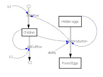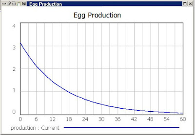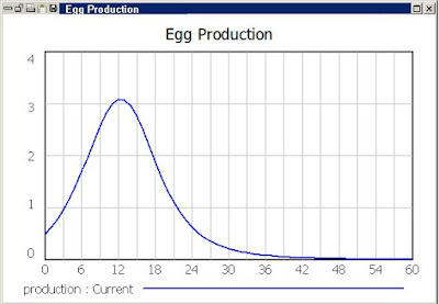 If the k's are kept constant over the production cycle, the shape of the curves generated by this model is exactly the same as with the simplified version, that isa symmetric, bell shaped production curve. Here are the results of a typical run: