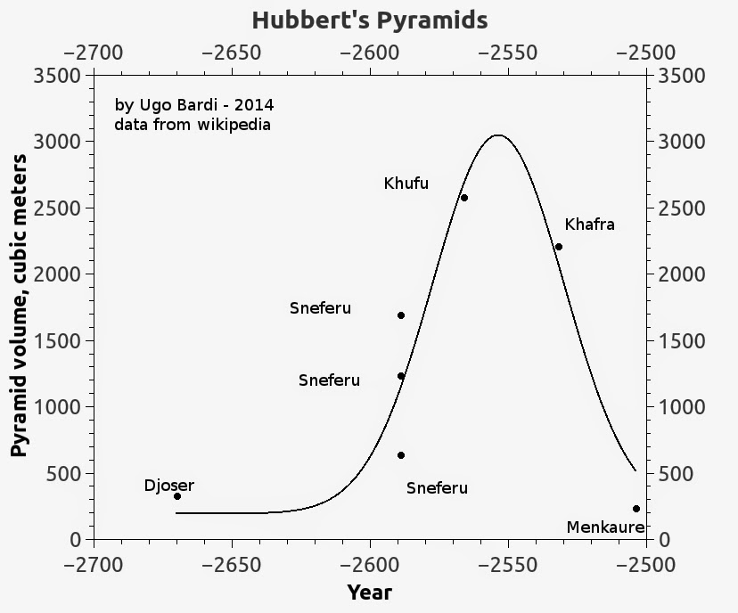 The graph above is a little exercise in cliodynamics, the attempt of quantitatively modeling historical data. Here, the size of the great Egyptian pyramids is plotted as a function of their approximate building date, taken as the last year of the reign of the Pharaoh associated to them. The data are fitted with a simple Gaussian, which approximates the cycle of the Hubbert model of resource depletion.